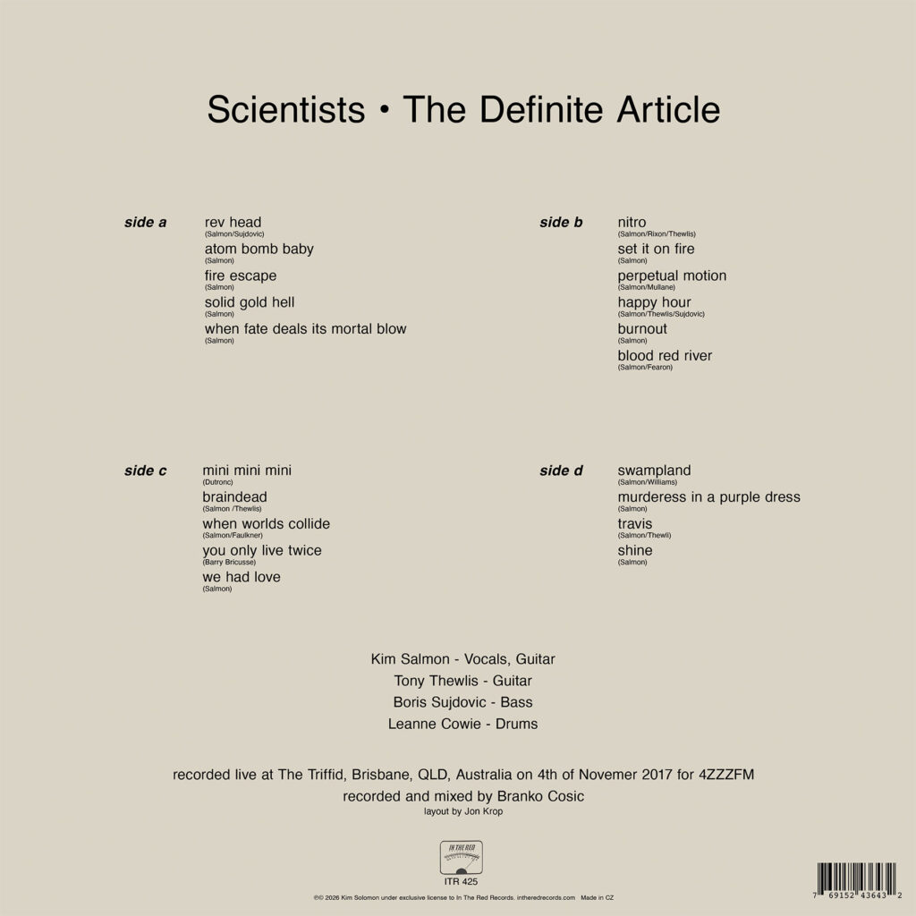 The Definite Article captures Australian rock legends The Scientists recorded live at The Triffid in Brisbane on November 4, 2017. The recording captures the band at their loud, noisy best, running through 20 songs from their catalog. The recording and the performance are so good the band released the recording on cassette on Emmett Kelleys Ha Ha label. The tapes were sold at shows and vanished quickly. In The Red is proud to present this fantastic live show on vinyl. A must for true heads. Limited color vinyl.